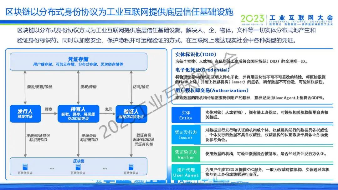 敖萌表示,區(qū)塊鏈以分布式身份協(xié)議方式為工業(yè)互聯(lián)網(wǎng)提供底層信任基礎(chǔ)設(shè)施,解決人、企、物體,文件等一切實(shí)體分布式地產(chǎn)生和驗(yàn)證身份標(biāo)識符。同時以加密安全,保護(hù)隱私并可遠(yuǎn)程驗(yàn)證的方式,在互聯(lián)網(wǎng)上表達(dá)現(xiàn)實(shí)社會中各種類型的憑證。