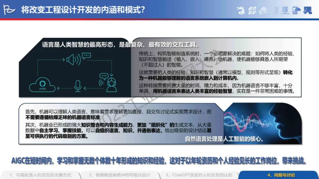 “自然語言處理是人工智能的核心,機器業已形成的強大知識整合和內容生成能力,更加“組織化”的生成文本,從大量數據中自主學習、掌握技能,可以自組織語言、知識,并通俗表達,給出穩妥的設計結論甚至可供執行的代碼級別的方案。”