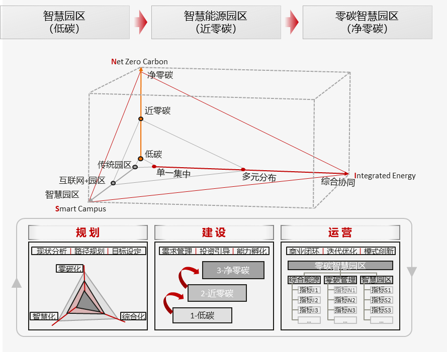 園區在規劃階段就引入了三元轉型方法論和四流融合價值體系指導園區的整體規劃,并采用GIS工具對園區的冷、熱、電、氣管網進行統籌設計。