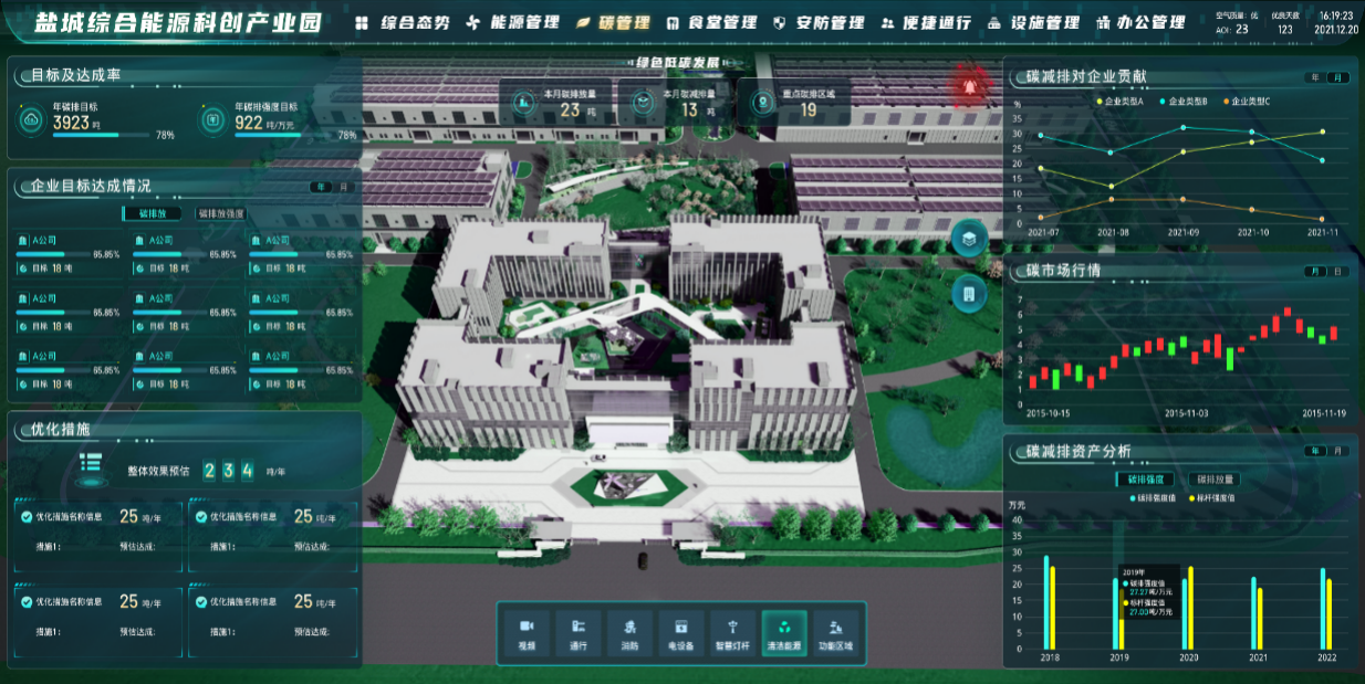 零碳管理是園區雙碳管理體系的基礎。通過碳排放監測實現對園區碳排放的實時、精確、全面計量,大幅提高碳排放統計的數據質量,并自動生成碳盤查報告,滿足主管部門監管要求,降低企業碳減排履約風險。為實現碳交易效益最大化,零碳管理系統對園區碳排放數據、排放因子數據、配額數據、碳匯數據等各種碳資產進行統一管理,為未來園區參與碳交易做好系統和數據準備,助力園區企業建立并完善碳資產管理、碳足跡管理、碳減排項目管理、碳市場預測等能力,支持企業靈活參與碳交易。