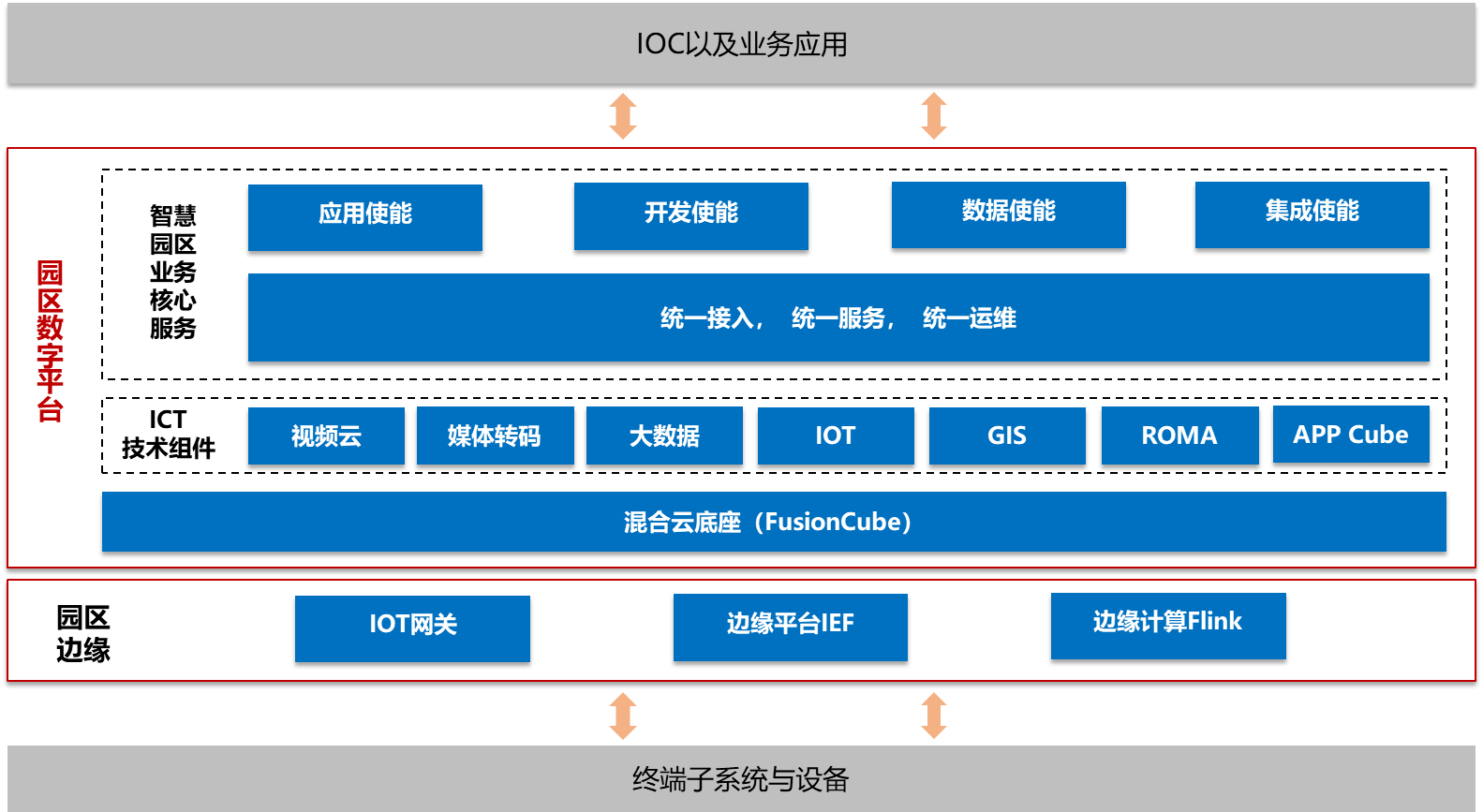 在技術方案方面,園區采用了最新的5G和WiFi6技術,實現園區無線網絡的全覆蓋。在園區廣泛部署智能物聯網關、智能攝像頭、能源路由器等邊緣智能設備,實現對園區人、車、物、能、碳等各種數據的全面采集。依托云、大、物、智等技術構建的數字平臺,對園區數據實現統一接入和匯聚、融合,對設備實現統一運維,對業務應用實現統一服務。綜合運營中心IOC實現園區各子系統的態勢感知、運營狀態可視化、業務分析和預警、決策支持和聯動指揮,實現對園區的智慧化管理。