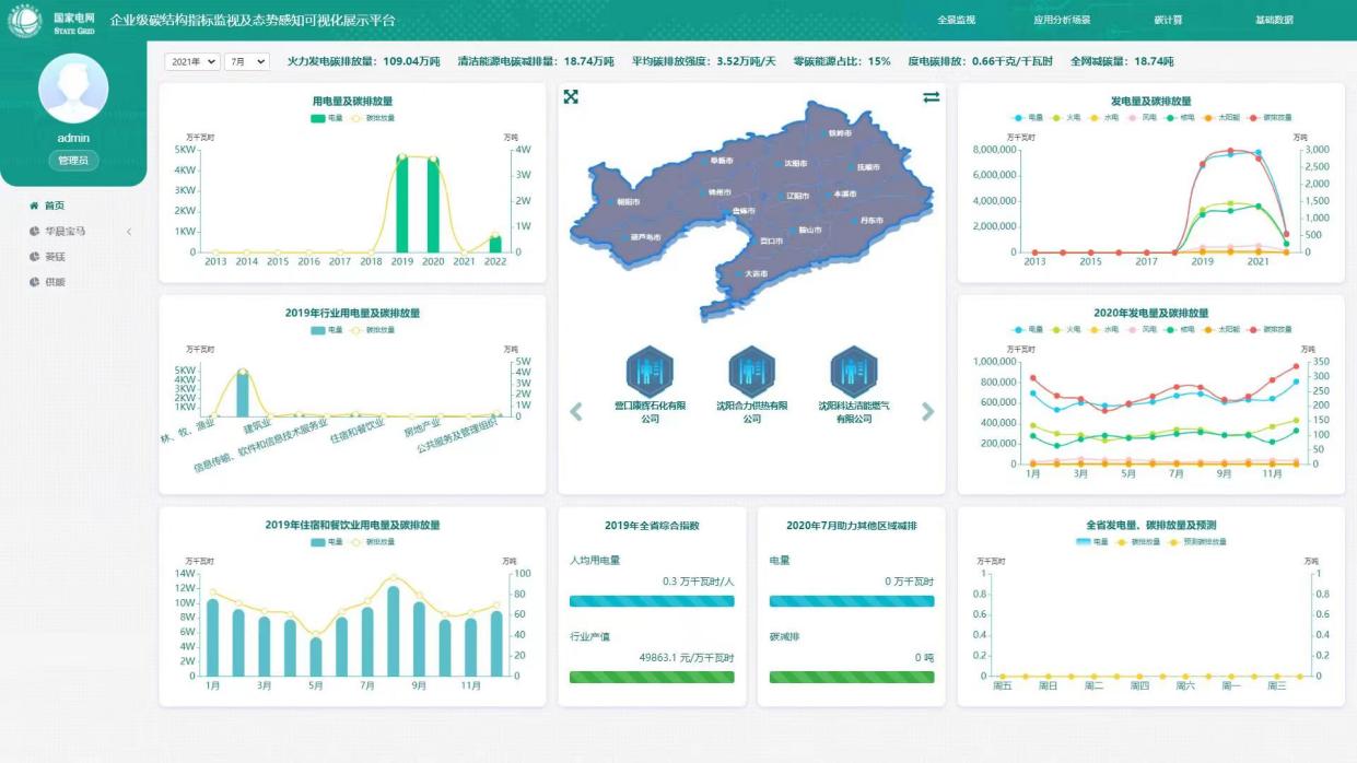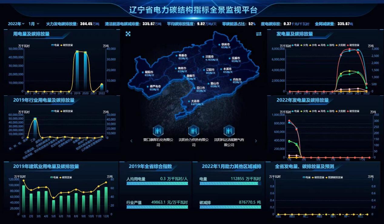 國家發展和改革委員會應對氣候變化司組織國家應對氣候變化戰略研究和國際合作中心研究確定了中國區域電網的平均二氧化碳排放因子。平臺基于遼寧省電碳熱力圖,火力發電碳排放量、平均碳排放強度等20項電碳指標,通過清潔能源占比、碳排放量增量、碳排放速率變化量、外送電量增量、清潔能源消納程度5個維度,構建區域“雙碳”綜合指數。通過“雙碳”綜合指數的開發,可以更全面的度量區域碳排放的實際情況,增加了碳排放管理的科學工具。在“雙碳”綜合指數的應用上,如何支持政府在產業調整、新上項目、創新發展等方面的具體決策,科學指導政府規劃計劃和實際工作落地實施,是輔助城市政府推進“雙碳”工作的重點。