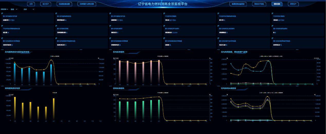 全省電量構成及碳排放監視方面,全省火電、水電、風電、太陽能、清潔能源發電占比情況,支持按年、月進行篩選,分析全省電力構成占比,并按日進行實時碳排放監測情況。