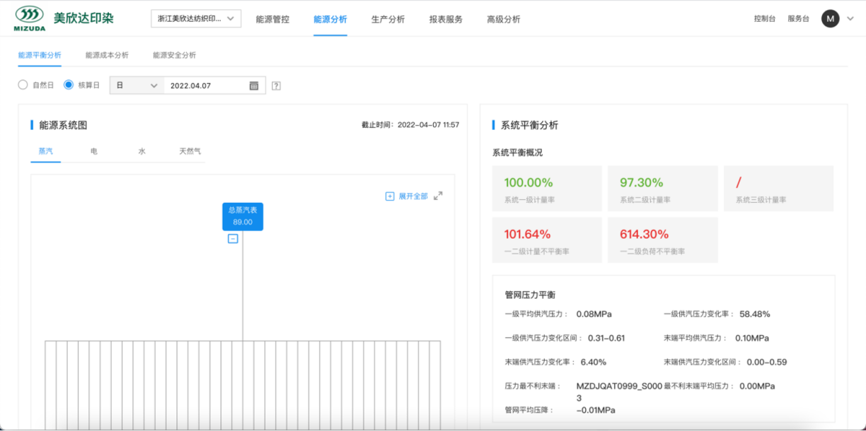 能源分析:能源分析是在企業明確能源系統結構,并且接入大量儀表傳感器數據的基礎上,對企業能源系統、能源消耗進行深入的監視分析,分析的維度包括平衡維度、質量維度、安全維度、用能成本維度等。