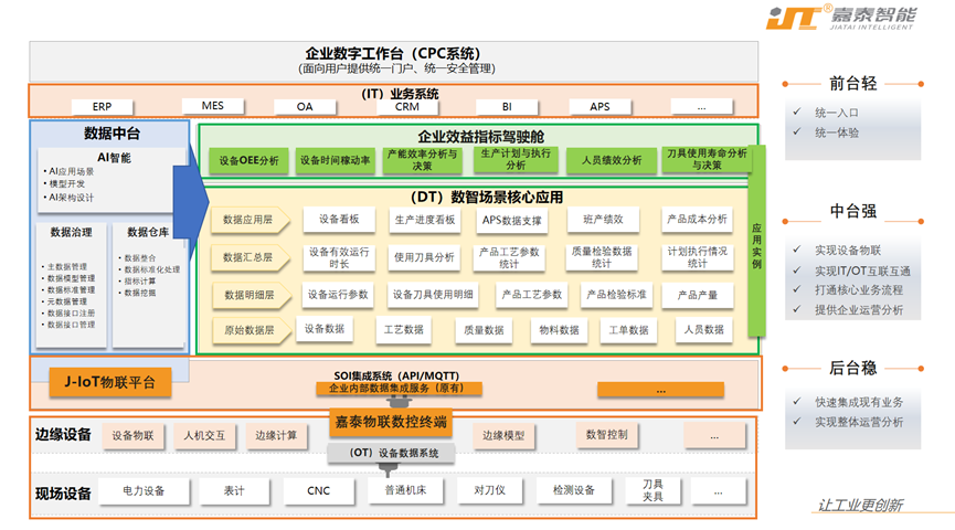 其中,物聯數控產品實現了對底層設備的接入、監管和反饋控制,滿足邊緣層的現場管控;物聯網平臺實現對物聯終端的全鏈條管理和底層數據封裝、改造、對接;數智場景核心應用針對關鍵環節抽取關鍵指標,融合業務流程和實時數據,以可視化形式進行監管提醒,形成不同業務目標的數據圖譜,實現價值信息的高效輸出。